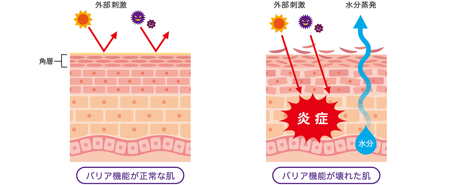 皮膚の最も外側にある「角層」には、外部の刺激や紫外線から体を守り、水分を保つ働きがあります。アトピー性皮膚炎の方は、この角層に含まれる「天然保湿因子」や「セラミド」の量が健康な皮膚に比べて少ないことがわかっています。また一部の方では角層の機能に重要な働きを持つ「フィラグリン」という遺伝子に異常があることもわかっています。そのため皮膚が乾燥しやすく、外部からアレルゲン(ダニ・ハウスダスト・花粉など)や細菌などが侵入しやすくなります。