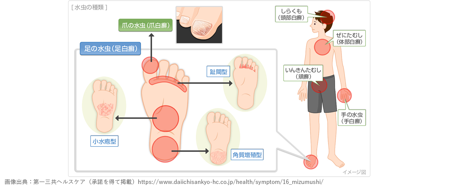 白癬は、白癬菌というカビが皮膚に寄生して起こる病気です。白癬菌は「ケラチン」というたんぱく質を栄養にして生きています。ケラチンは皮膚の表面を覆う角層や、爪・毛の主成分であるため、白癬菌は皮膚・爪・毛に寄生します。