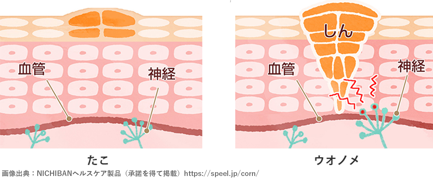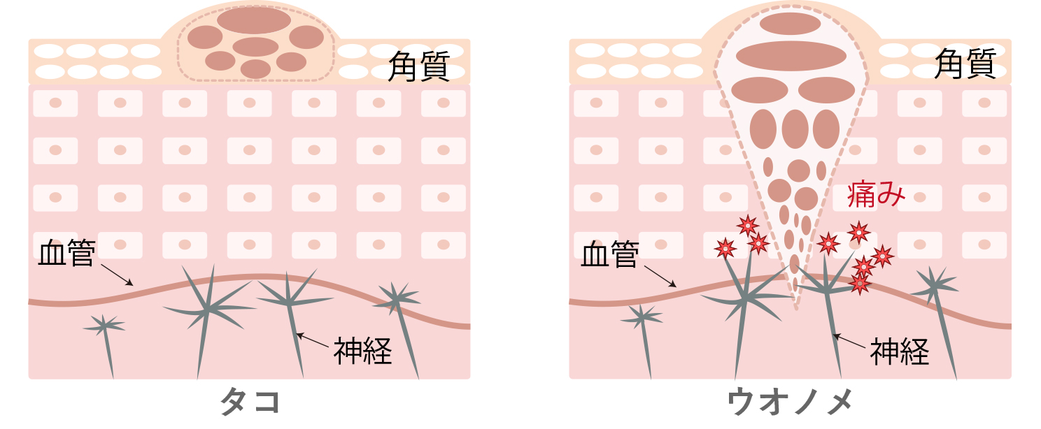 タコは通常痛みを伴いませんが、魚の目は角質が厚く芯のようになり、真皮に向かって楔状に食い込むため、神経を圧迫して痛みを生じます。