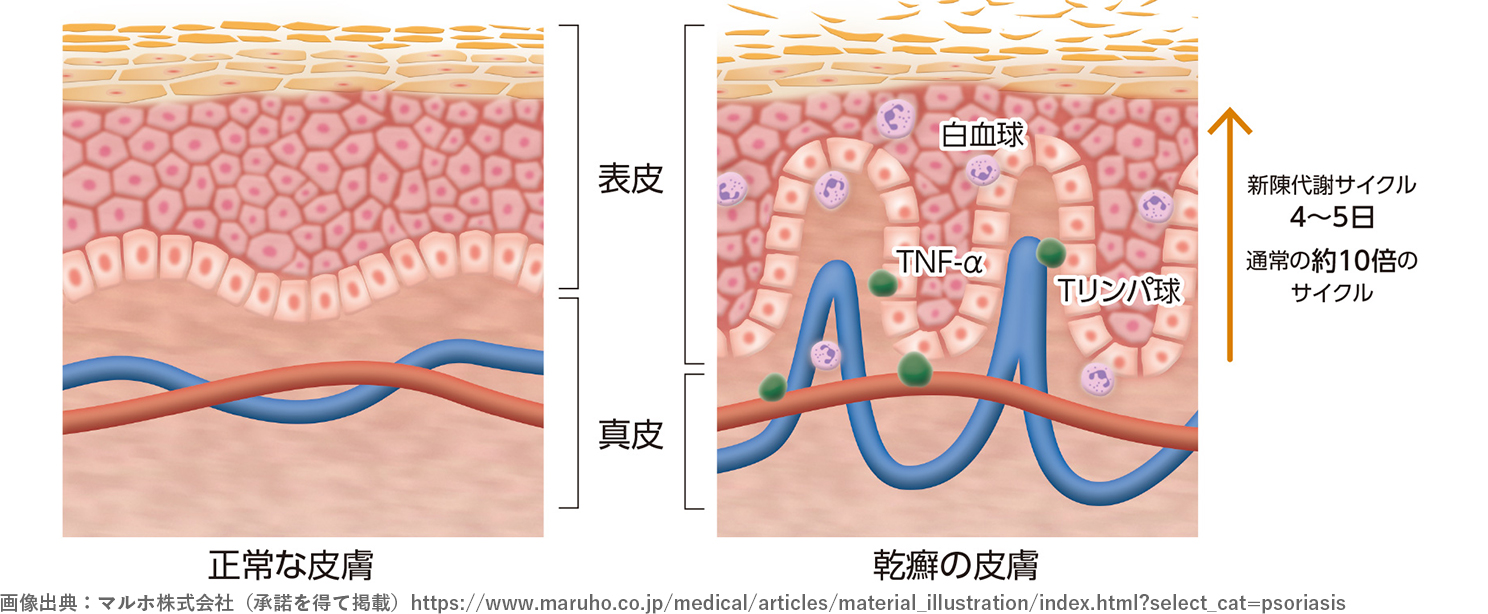 通常、表皮細胞は約28〜40日かけて新しく入れ替わりますが、乾癬の患者さんではわずか4〜5日で入れ替わってしまいます。そのため、未成熟な表皮細胞が厚く積み重なり、鱗屑(りんせつ)となって剥がれ落ちていきます。
