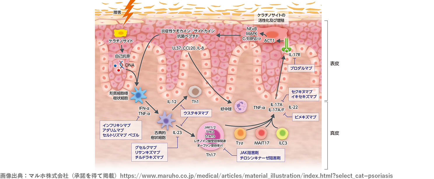 免疫の異常により「サイトカイン」と呼ばれる物質が過剰に分泌され、体を攻撃して「炎症」を起こし、皮膚が赤くなります。さらに、皮膚の一番外側にある「表皮細胞」が異常に増えてしまいます。